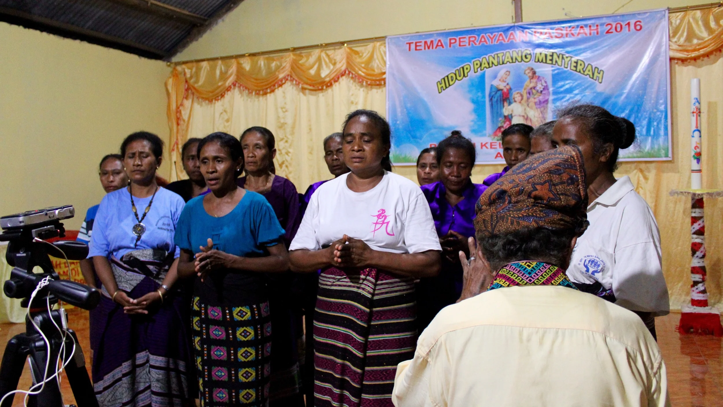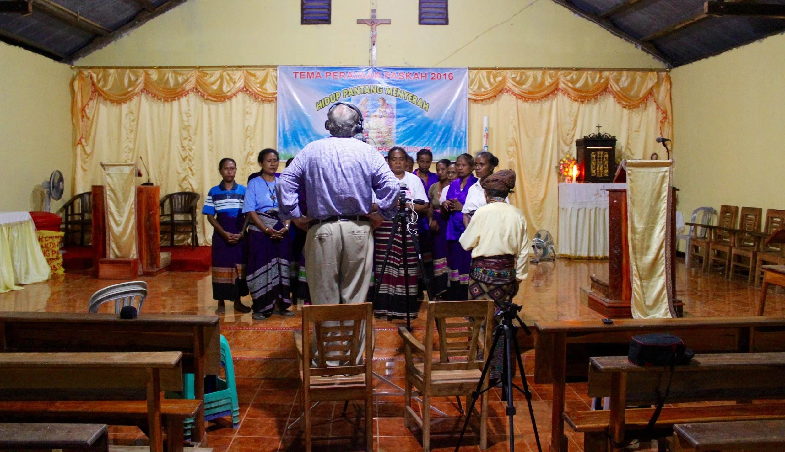 Just as we were set to record, the power went out in the church, a profound darkness filling the space. As we’d gotten the video out of the way before, we carried on anyway, a small flashlight casting shadows of the choir behind their heads. It was an unreal experience, sitting in the dark of a Catholic church in Timor, the noise of crickets coming in through the windows, a field recording legend listening carefully by my side. The women, now decked out in tenun and t-shirts, were remarkably professional despite never having sung in such a context. Their voices, ringing out through the dark, were pitch perfect.