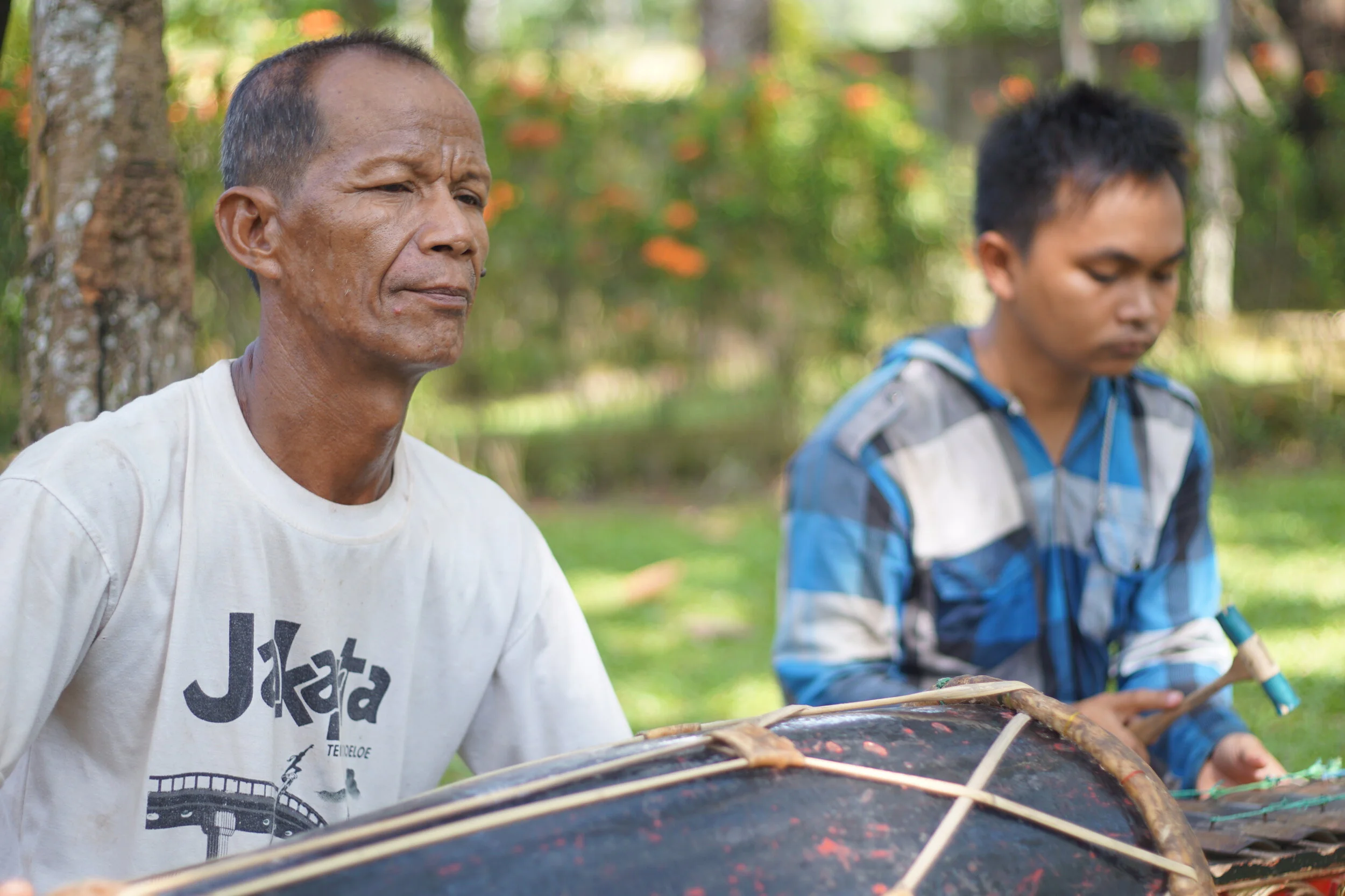 And then there’s gamalan, a pared-down take on that ancient Javanese import. As my friend, Banjarese ethnomusicologist Novyandi Saputra, explained, the instrumentation of Dayak Halong gamalan is pretty minimalistic compared to its Banjarese counterpart. While gamalan Banjar is fleshed out with fundamental Javanese-inspired instruments like dawu (similar to Javanese bonang) and kanong (equivalent to Javanese kenong), Dayak Halong gamalan is simplified enough to be played by just five musicians: one playing two large hanging gongs or agung, one (or two) playing the seven-keyed metallophone called sarun, one playing the double-headed barrel drum called babun, and one manning the sixteen-keyed gambang xylophone.